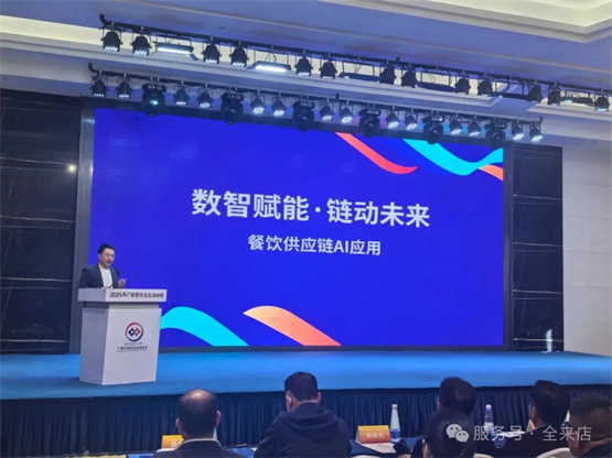 全来店作为大会特邀开场分享嘉宾,受广西烹饪餐饮行业协会正式邀请,在会上进行了主题为《数智赋能·链动未来——餐饮供应链AI应用》的主题演讲,从行业趋势、供应链变革以及AI落地场景三个方面展开深入分享,为广西餐饮产业的智能化升级带来了前瞻思考与实战经验。