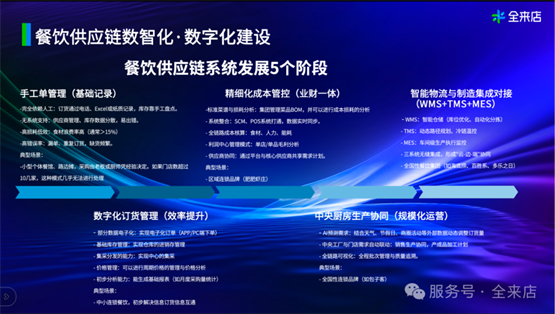 结合大量企业案例和系统实践,全来店在会上系统展示了餐饮供应链数智化的五个发展阶段——从基础数字化、流程透明化到智能预测、全链协同以及生态链接。